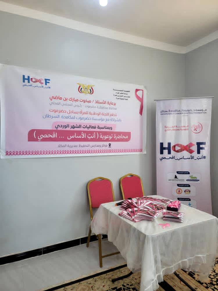 انطلاقًا من مسؤوليتها المجتمعية وحرصها على تمكين المرأة صحياً، نفذت اللجنة الوطنية للمرأة بحضرموت الساحل، بالشراكة الاستراتيجية مع مؤسسة حضرموت لمكافحة السرطان، محاضرة توعوية بمناسبة الشهر الوردي العالمي للتوعية بسرطان الثدي بمدرسة تحفيظ أهل القرآن الكريم بفوة امبيخه ، في خطوة تهدف إلى دمج الرسالة الصحية مع الإيمان بأهمية الحفاظ على نعمة الصحة. حيث استهدفت المحاضرة طالبات ومعلمات مدرسة التحفيظ . وتميزت المحاضرة التي قدمتها الأستاذة خديجة باوزير من مؤسسة حضرموت لمكافحة السرطان، بعرض شيق وواضح عن المرض وآثاره وعوامل الخطورة وكيفية الفحص الذاتي وثقافة الكشف المبكر وكيفية الوقاية من المرض ، كما قامت إحدى الاخوات بتسليط الضوء على خدمات مؤسسة حضرموت لمكافحة السرطان .