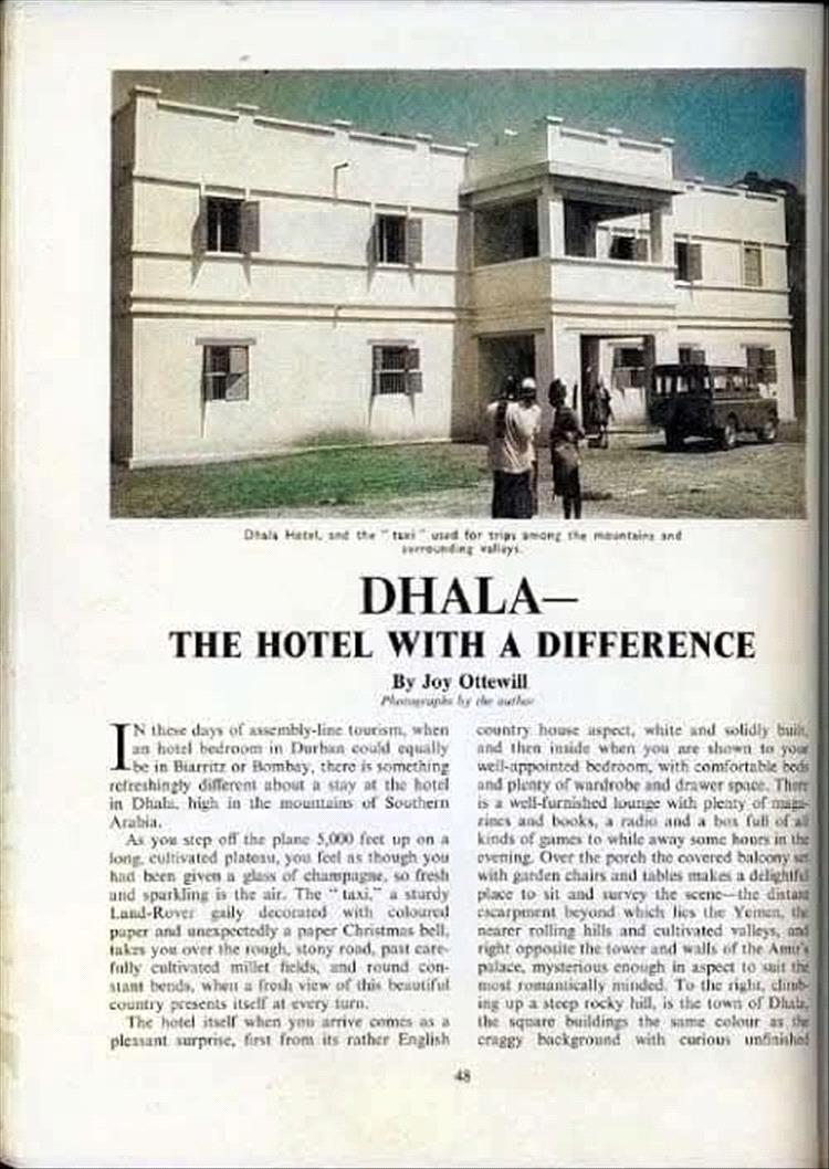 هناك عدد من الرحلات الشيقة التي يمكن إجراؤها من الفندق. يتم إجرائها بواسطة "سيارة الأجرة" اللاند روفر، وكلما زاد حجم المجموعة التي يمكن تكوينها ، أصبحت الرحلة أرخص للشخص الواحد. هناك رحلة واحدة إلى قمة جبل جحاف ، وهو جبل مذهل يرتفع إلى 8000 قدم فوق مستوى سطح البحر و 3000 قدم فوق هضبة الضالع. الرحلة الفعلية بالسيارة مثيرة مع القطرات الهائلة في كلتا اليدين ، والمشهد من الأعلى لا يُنسى تمامًا. رحلة مثيرة أخرى هي الى حصن دار سناح على الحدود اليمنية مباشرة ، حيث يمكنك من أعلى الحصن مشاهدة الوادي الواسع الذي يشكل "المنطقة المحرمة" بين الاتحاد واليمن إلى الحصن اليمني والجرف الهائل وراءه. تأخذك هذه ال,حلة بالسيارة عبر مناظر جميلة ومتنوعة من الوديان المزروعة والألواح المظللة بالأشجار ، وصعود التلال الصخرية ، مروراً بالمزارعين المدججين بالسلاح والنساء بفساتين ملونة طويلة يعملون في الحقول أو يركبون الحمير فوق الممرات الصخرية إلى القرية التي تم وضعها كما هو الحال دائمًا ، فوق ارتفاعات تبدو منيعة.
