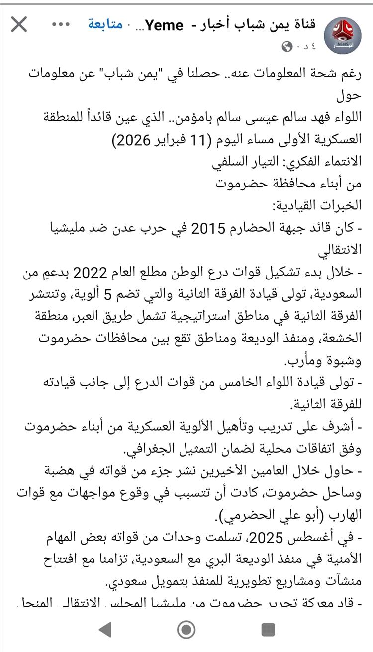 الخميس - 12 فبراير 2026 - الساعة 02:28 م بتوقيت العاصمة عدن