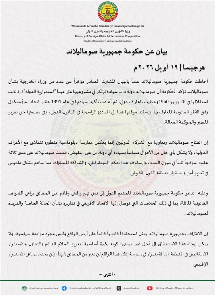 بيان صادر عن حكومة جمهورية صوماليلاند بشأن البيان المشترك لوزراء خارجية عدد من الدول، وتأكيدًا لسيادتها القائمة على الواقع والقانون الدولي